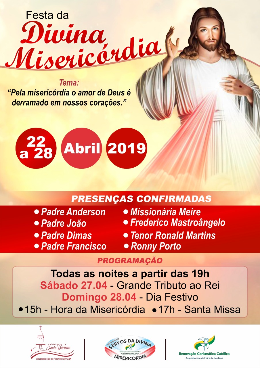 Entre os dias 22 e 28 de abril de 2019 a paróquia de Santa Bárbara estará na Semana da Misericórdia, onde no domingo (28) será celebrado a grande festa da Divivina Misericórdia, que já está em sua 10ª edição. Essa festividade foi instituída durante o pontificado do Papa João Paulo II, hoje santo, em obediência ao mandato de Jesus a Santa Faustina Kowalska, a secretária da Misericórdia, onde em visão Jesus teria expressado a ela o desejo de que no domingo seguinte a Páscoa fosse celebrada a Festa da Misericórdia, e assim o mundo fosse mergulhado no mar infinito da Misericórdia Divina. Este ano todos são convidados a experimentarem o amor de Deus e sua Misericórdia através do tema central: “Pela misericórdia o amor de Deus é derramado em nossos corações”. Ao longo da semana a programação se inicia às 19h e no grande dia festivo, o domingo, às 15h.
