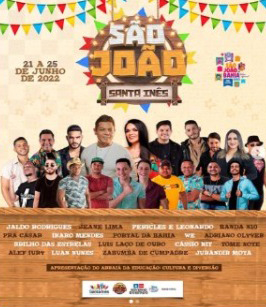 A Prefeitura de Santa Inês, juntamente com a Secretaria de Cultura, vai realizar o São João com muito entusiasmo e seriedade, valorizando os artistas, filhos da terra e trazendo grandes atrações de nível nacional.