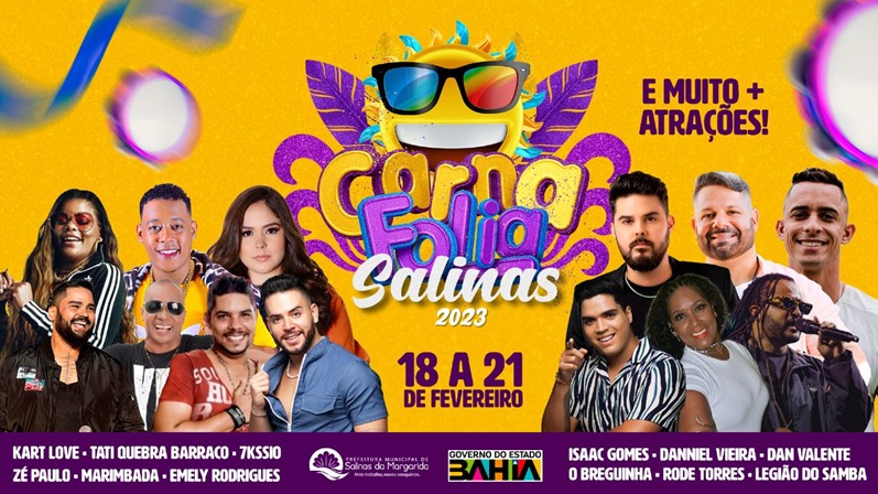 O Carnaval de Salinas 2023 está repleto de atrações. A Prefeitura de Salinas, divulgou na tarde de ontem a grade com as atrações que vão participar do carnaval entre os dias 18 e 21 de fevereiro.