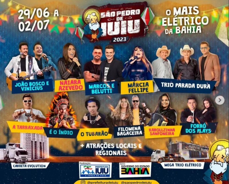 A Prefeitura de Iuiu confirmou a realização do São Pedro da cidade. O evento que é um dos mais tradicionais do oeste baiano recebe a alcunha de “O São Pedro mais Elétrico da Bahia”. A festa que é parte do calendário junino de 2023 no município será realizado entre os dias 29 de Junho e 02 de Julho em dois circuitos e contará com as apresentações de diversos artistas nacionais e locais além de arrastão com trios e paredões. Confira a grade de atrações do evento: