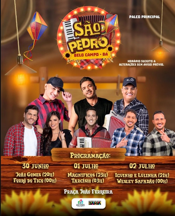 A Prefeitura de Belo Campo divulgou nas suas redes sociais e canais de comunicação as atrações escolhidas para a tradicional Festa de São Pedro de 2023. A festa será realizada na Praça João Ferreira nos dias 30/06, 01 e 02 de Julho. Confira a programação do evento: