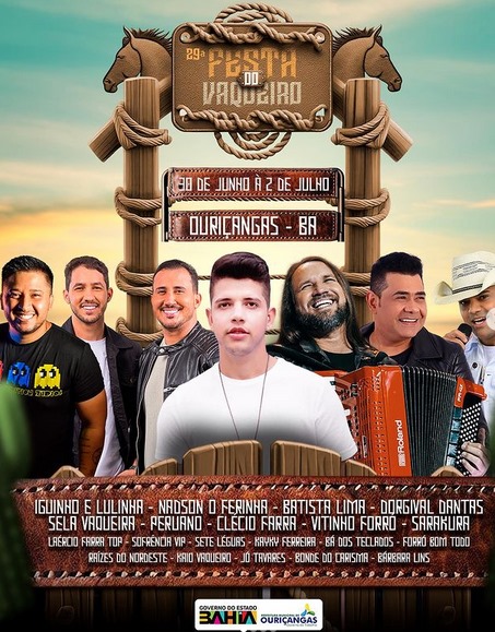 A grade oficial da 29ª Festa do Vaqueiro de 2023, em Ouriçangas/BA, foi divulgada! Nos dias 30/06 a 02/07, as melhores atrações vão animar a população, com muito forró, sofrência e sertanejo. Vai ficar fora dessa?