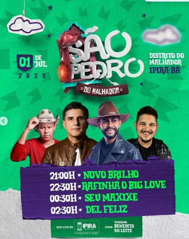 O maior São Pedro da região está chegando! No Distrito do Malhador, prepare-se para uma programação super especial, a Prefeitura Municipal de Ipirá acaba de divulgar os nomes dos artistas que irão compor a grade, são elas: Rafinha Big Love, Seu Maxixe, Del Feliz e Novo brilho, dia 01 de junho de 2023, não fique de fora dessa festa!