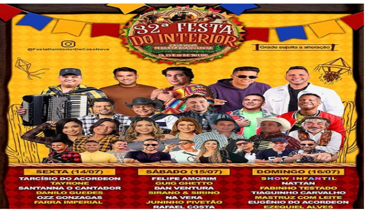 A 32ª edição da Festa do Interior será realizada de 14 a 16 de julho, em Casa Nova (BA). A programação completa do evento foi divulgada na quinta-feira (29), através das redes sociais do prefeito Wilker Torres (PSB).