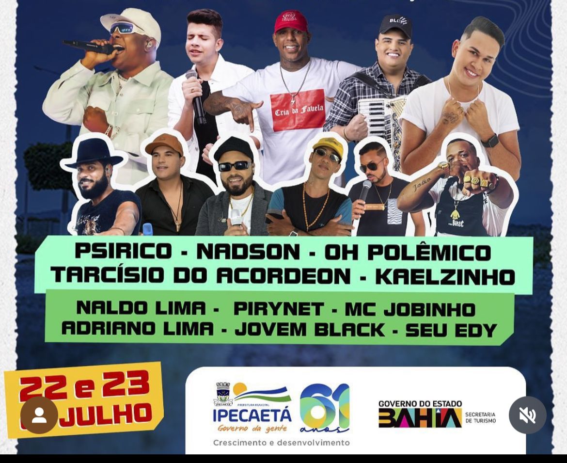 A Prefeitura de Ipecaetá anunciou nas suas redes sociais a realização de uma grande festa nos dias 22 e 23 de Julho. O evento que faz parte do calendário festivo de 2023 no município reunirá grandes atrações de diversos gêneros musicais. Confira abaixo: