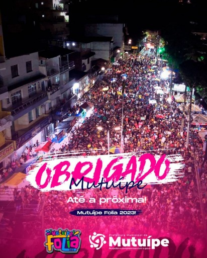 Com muita dedicação e organização para a segurança de todos a Prefeitura Municipal de Mutuípe organizou o Mutuípe Folia 2023 e foi um grande sucesso, com o apoio do Governo do Estado da Bahia, através do órgão Superintendência de Fomento ao Turismo, de 12 a 15 de outubro passaram mais de 100 mil pessoas, uma festa inigualável que ficará marcado em nossos corações, agradecemos a cada um de vocês que tornaram possível e até 2024. Confira a programação que tornou o evento ainda mais especial.