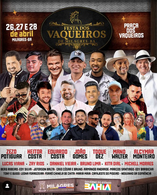 Notícias do Estado Festa dos Vaqueiros de Milagres 2024: Tradição e modernidade em destaque By terrasantanoticias - 30 de março de 2024 0 46 Compartilhar no Facebook Tweet on Twitter Com uma grade de “Arrebentar”, Festa dos Vaqueiros de Milagres lança programação completa e gera uma expectativa de ser a maior de todos os tempos. O evento terá realização da Prefeitura de Milagres e apoio do Governo da Bahia.
