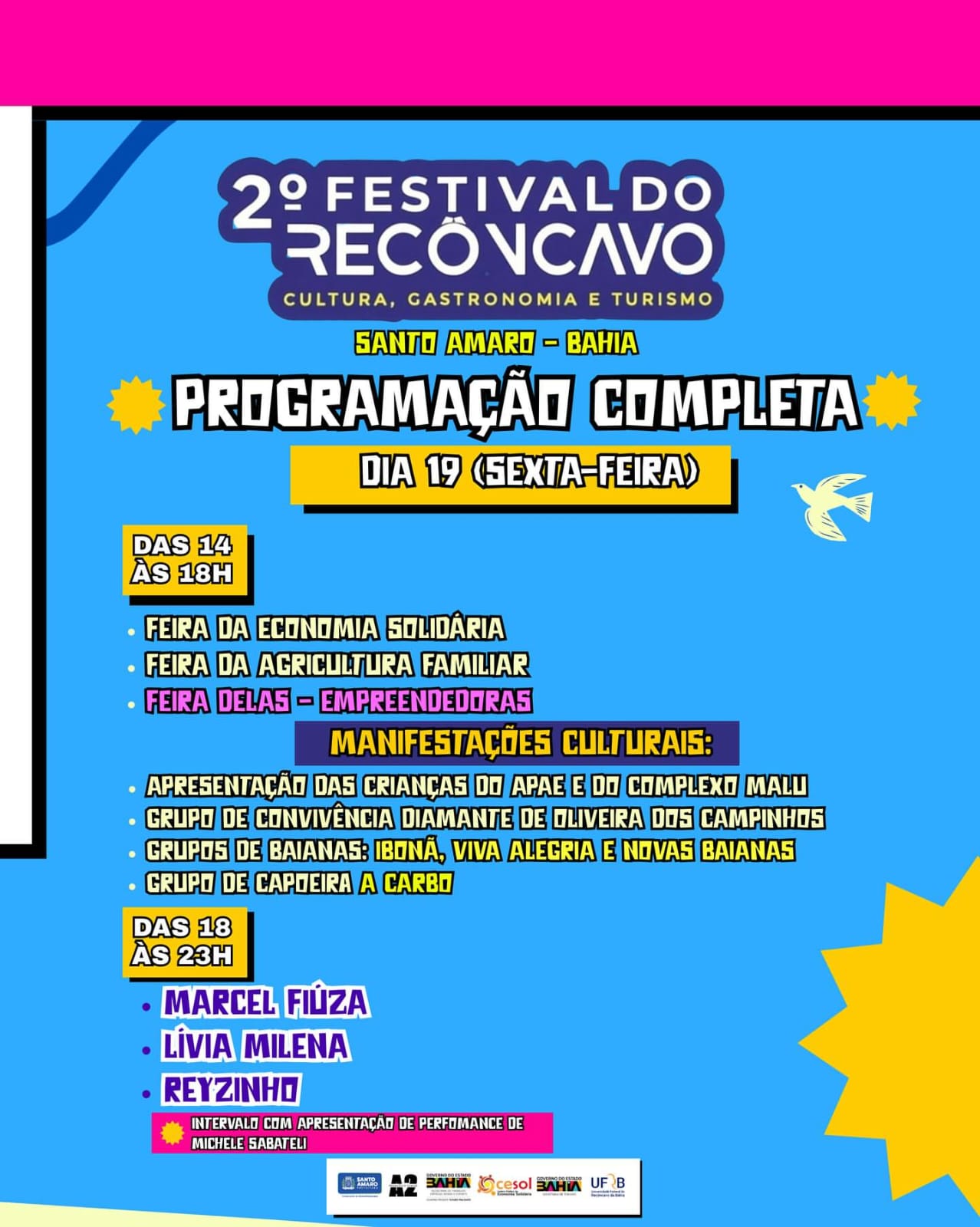 Das 14h às 18h, o público poderá visitar a Feira da Economia Solidária, a Feira da Agricultura Familiar e a Feira Delas – Empreendedoras, espaços dedicados à valorização do trabalho local e à divulgação de produtos típicos do Recôncavo.