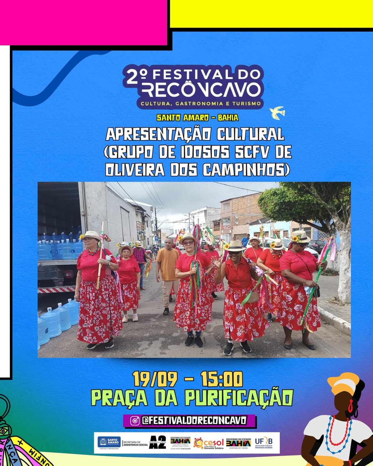 O 2º Festival do Recôncavo segue ganhando forma com a confirmação de diversas atrações culturais que prometem valorizar a tradição e a identidade da região. Entre os destaques, está a apresentação do Grupo de Idosos do Serviço de Convivência e Fortalecimento de Vínculos (SCFV) de Oliveira dos Campinhos, que se apresentará no dia 19 de setembro, às 15h, na Praça da Purificação, em Santo Amaro.