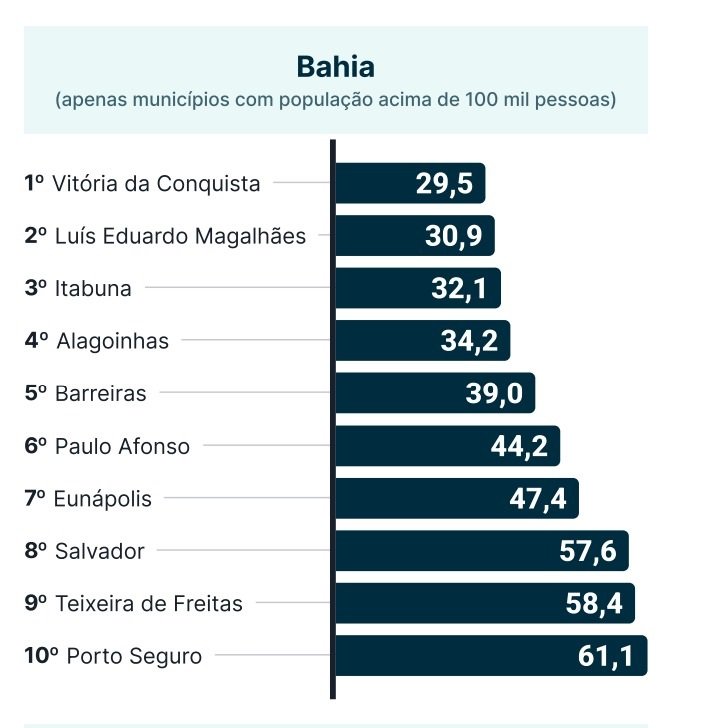 Na Bahia, o ranking é liderado por Vitória da Conquista, seguida por Luís Eduardo Magalhães, Itabuna, Alagoinhas e Barreiras. Porto Seguro aparece em décimo lugar, com uma taxa superior a 60 homicídios por 100 mil habitantes.