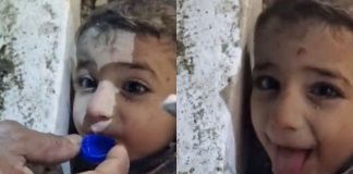Criança recebe água em tampa de garrafa enquanto aguarda resgate dos...