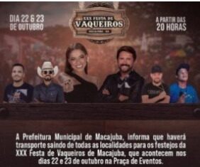 A Prefeitura Municipal de Macajuba juntamente com a Associação dos Vaqueiros oficializou as datas para a 30ª Festa dos Vaqueiros do município que acontecerá nos dias 22 e 23 de outubro de...