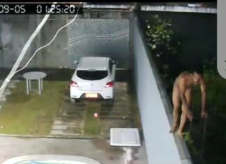 Câmeras de segurança flagraram um homem completamente sem roupa em cima do muro de uma residência na madrugada da...
